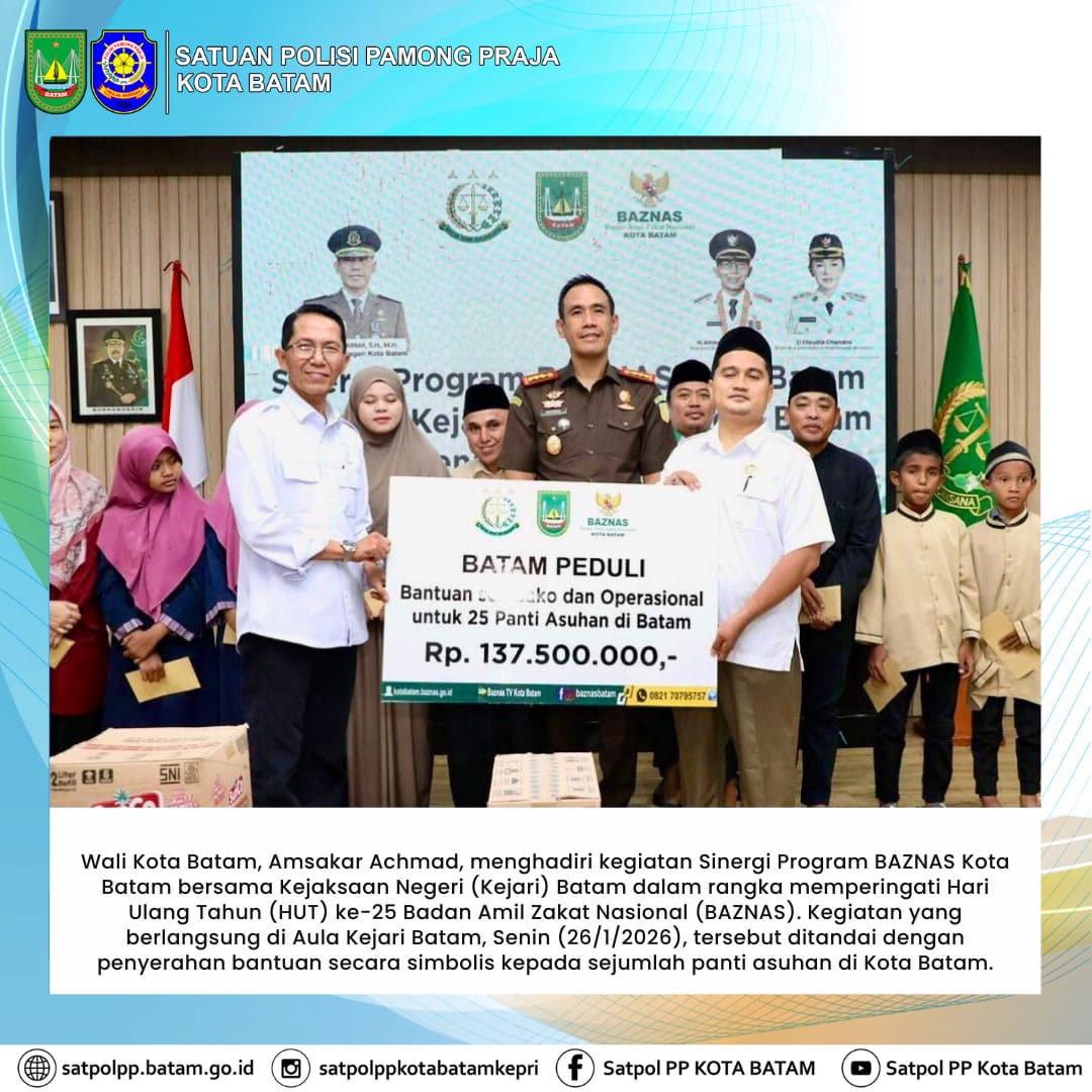 Wali Kota Batam, Amsakar Achmad, menghadiri kegiatan Sinergi Program BAZNAS Kota Batam bersama Kejaksaan Negeri (Kejari) Batam dalam rangka memperingati Hari Ulang Tahun (HUT) ke-25 Badan Amil Zakat Nasional (BAZNAS). Kegiatan yang berlangsung di Aula Kejari Batam, Senin (26/1/2026), tersebut ditandai dengan penyerahan bantuan secara simbolis kepada sejumlah panti asuhan di Kota Batam.
