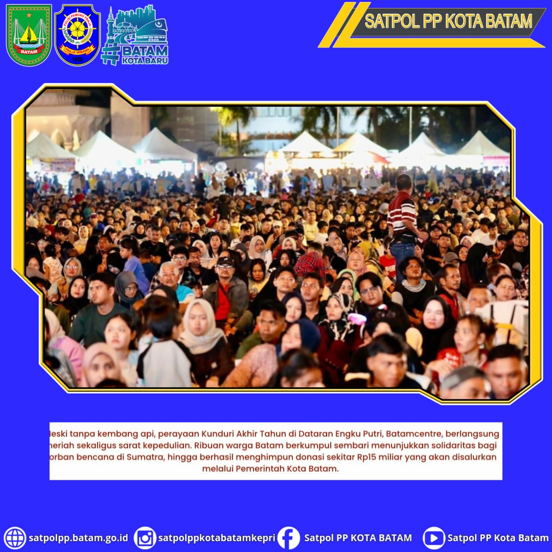 Meski tanpa kembang api, perayaan Kunduri Akhir Tahun di Dataran Engku Putri, Batamcentre, berlangsung meriah sekaligus sarat kepedulian. Ribuan warga Batam berkumpul sembari menunjukkan solidaritas bagi korban bencana di Sumatra, hingga berhasil menghimpun donasi sekitar Rp15 miliar yang akan disalurkan melalui Pemerintah Kota Batam.